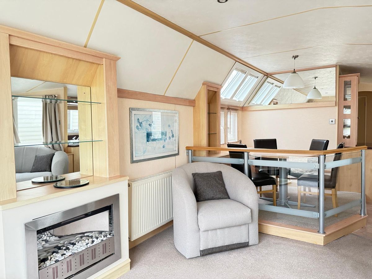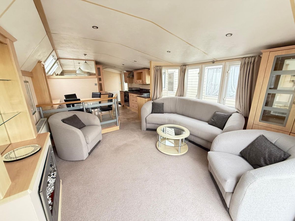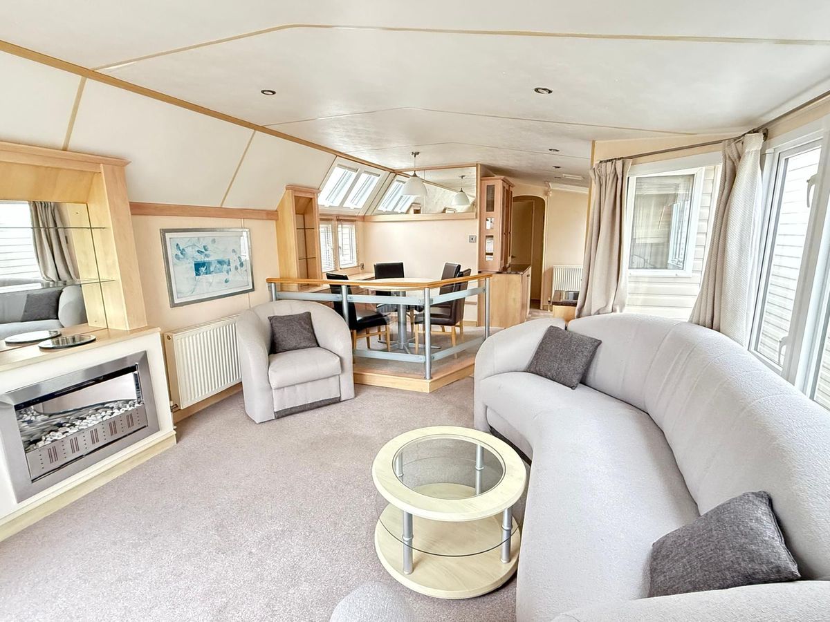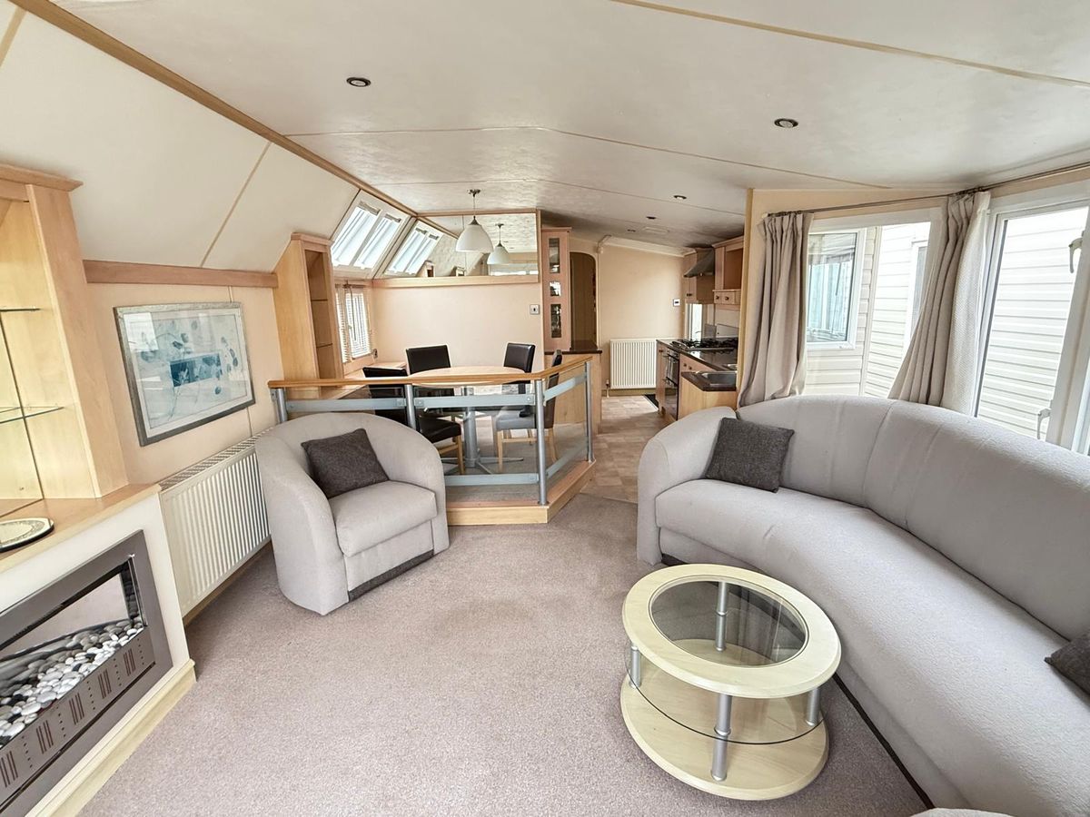 SALÓN, muy luminoso gracias al VENTANAL DE LA TERRAZA, con amplia zona de estar muy cómoda con posibilidad de abatir plazas adicionales para dormir. Equipado con mesa de café y chimenea.