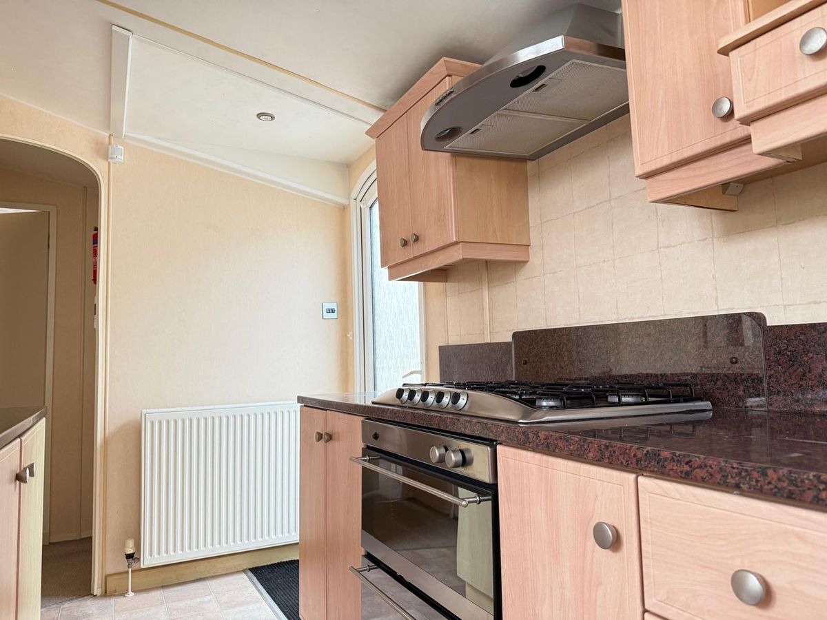 COCINA con distribución funcional, totalmente equipada con amplios armarios y encimera. Está equipada con una cocina a gas de cuatro fuegos, un horno empotrado con grill, una campana extractora, una nevera con congelador empotrado y un fregadero de esquina junto a las ventanas.