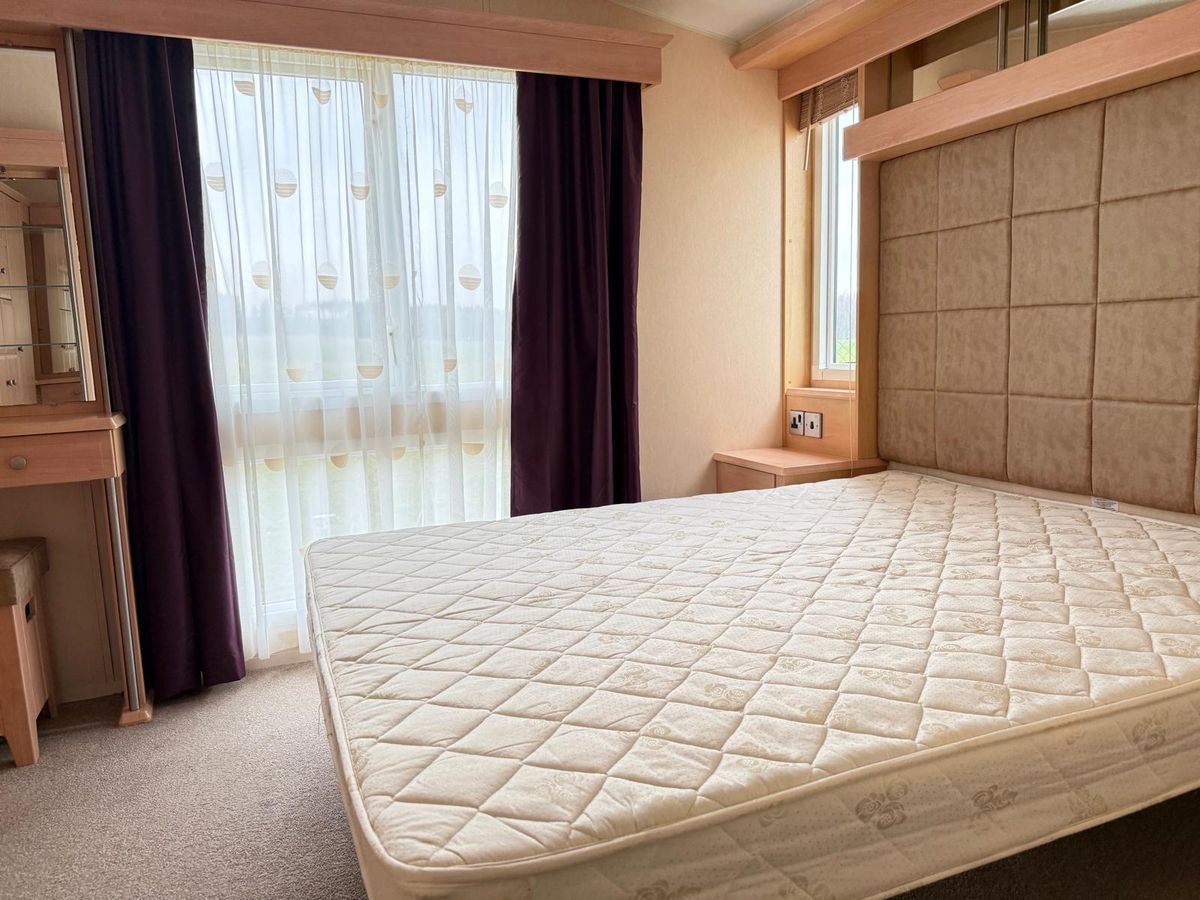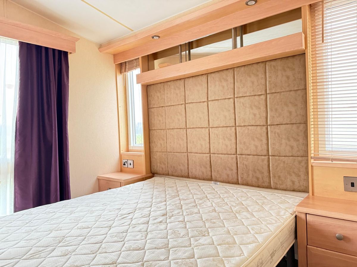 DORMITORIO 1 con amplio ventanal, dispone de una amplia cama de matrimonio con cabecero suave, junto a ella se encuentran dos mesitas de noche. La habitación está equipada con amplios armarios, tocador con espejo y acceso directo al baño privado con bañera.