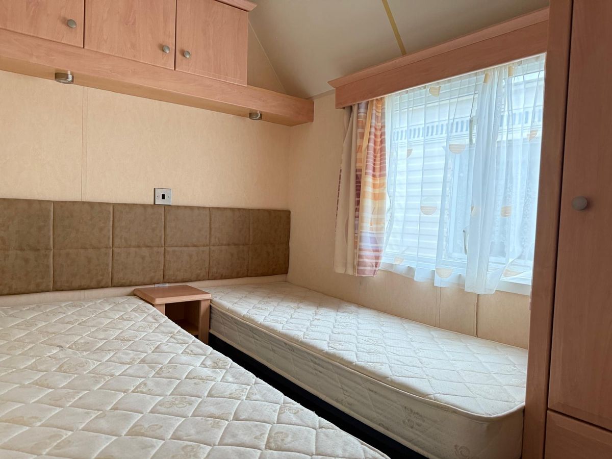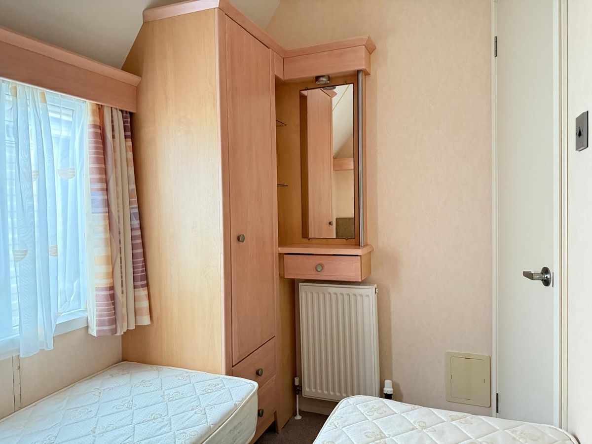 EL DORMITORIO 2 contiene dos camas individuales con cabeceros suaves, una mesita de noche, armarios y un espejo.
