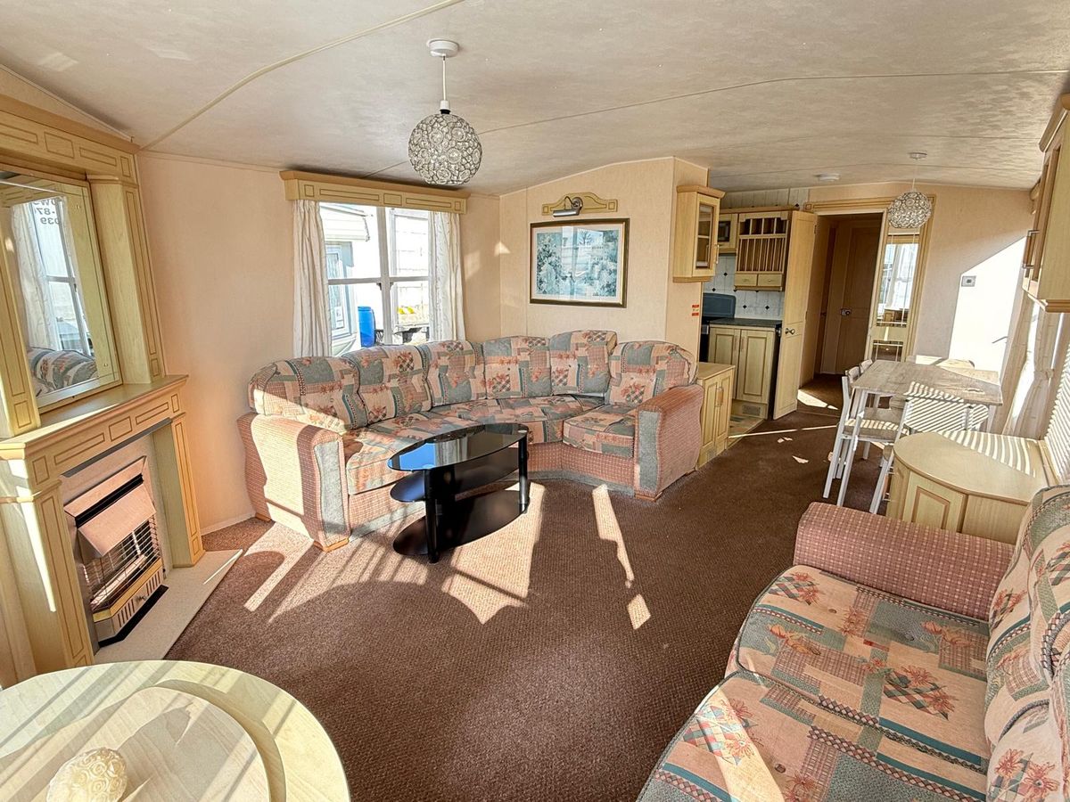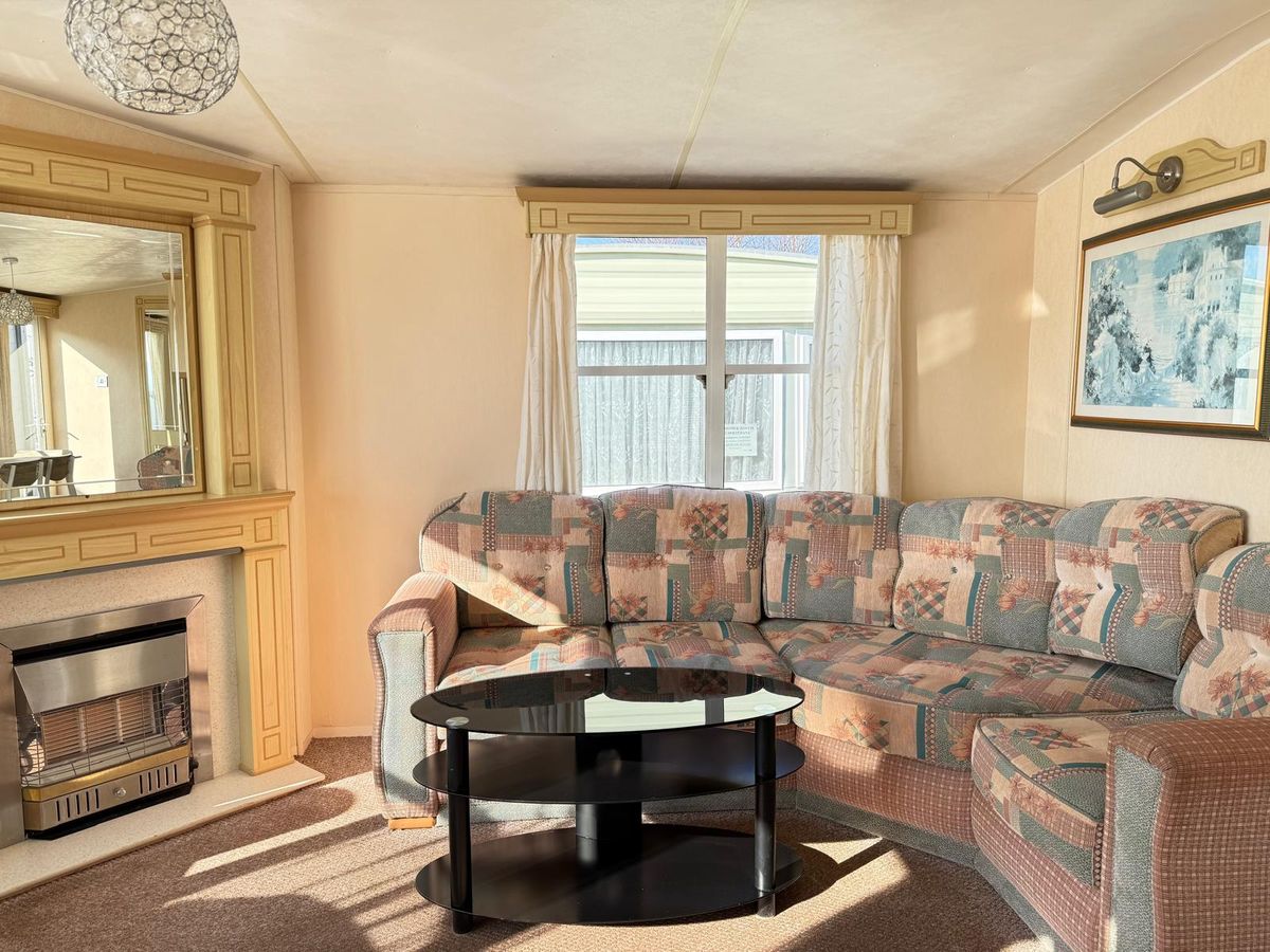SALA DE ESTAR con una cómoda zona de estar con posibilidad de plazas adicionales para dormir, armarios de almacenamiento, chimenea, espejo y cortinas en las ventanas.