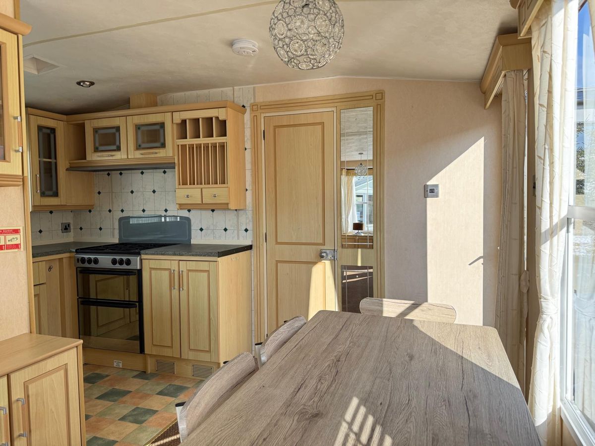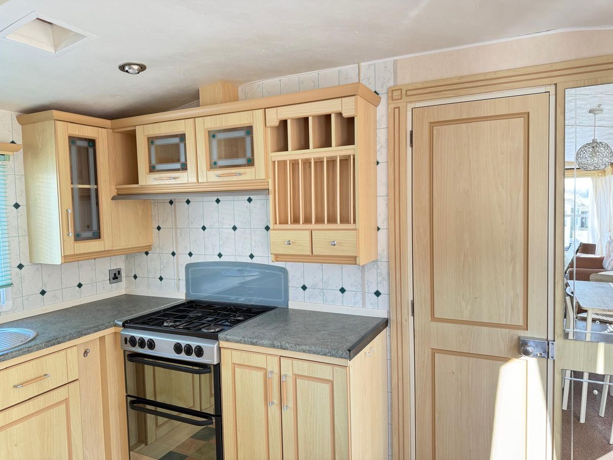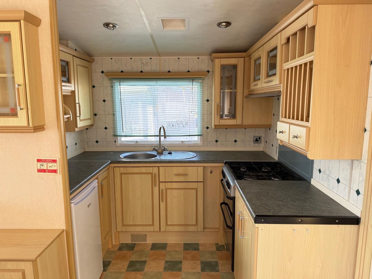COCINA totalmente equipada con amplios armarios de almacenaje, cocina a gas de cuatro quemadores con horno y grill, frigorífico, microondas y fregadero de ventana con persiana.