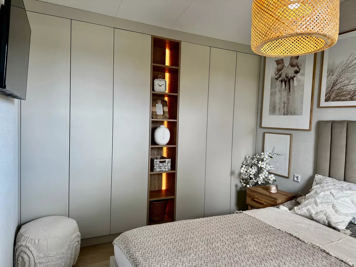 SALÓN con un cómodo sofá convertible en plazas adicionales para dormir, mesa de centro, vitrina de cristal, armarios y un gran acristalamiento con entrada a la terraza.