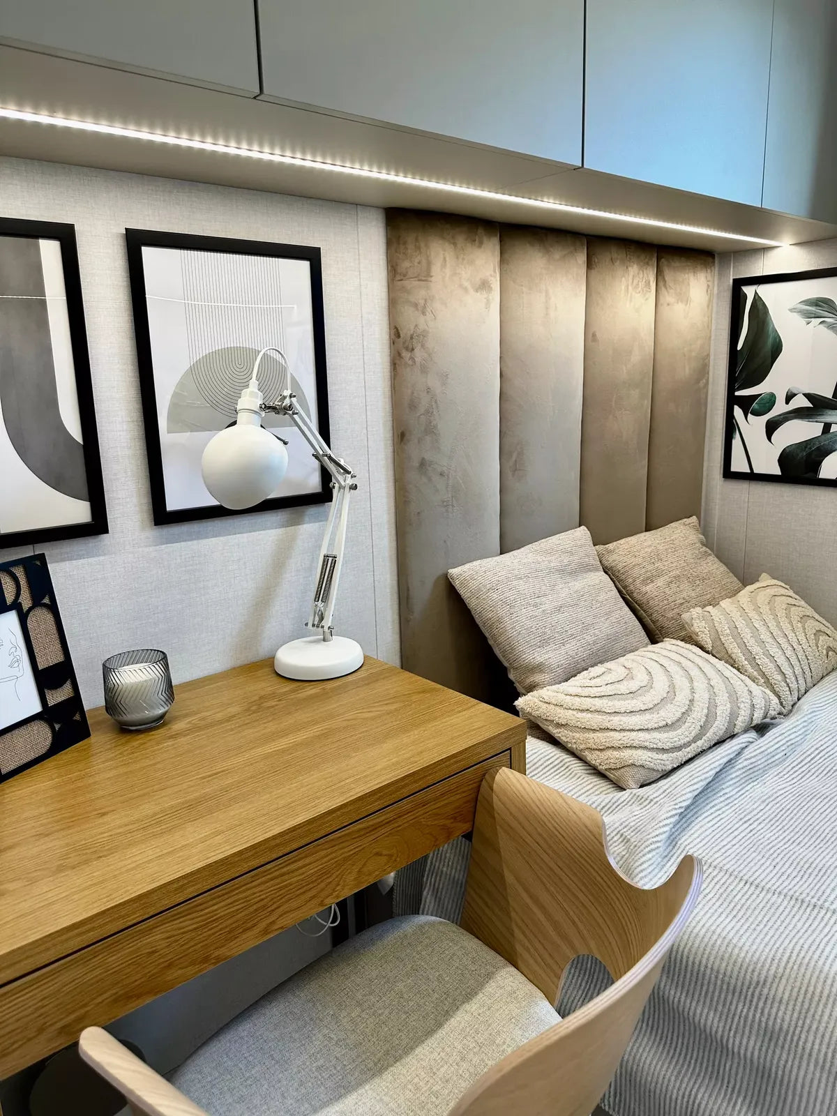 DORMITORIO PEQUEÑO con cama de matrimonio con cabecero tapizado, colchón, escritorio con silla y armarios.