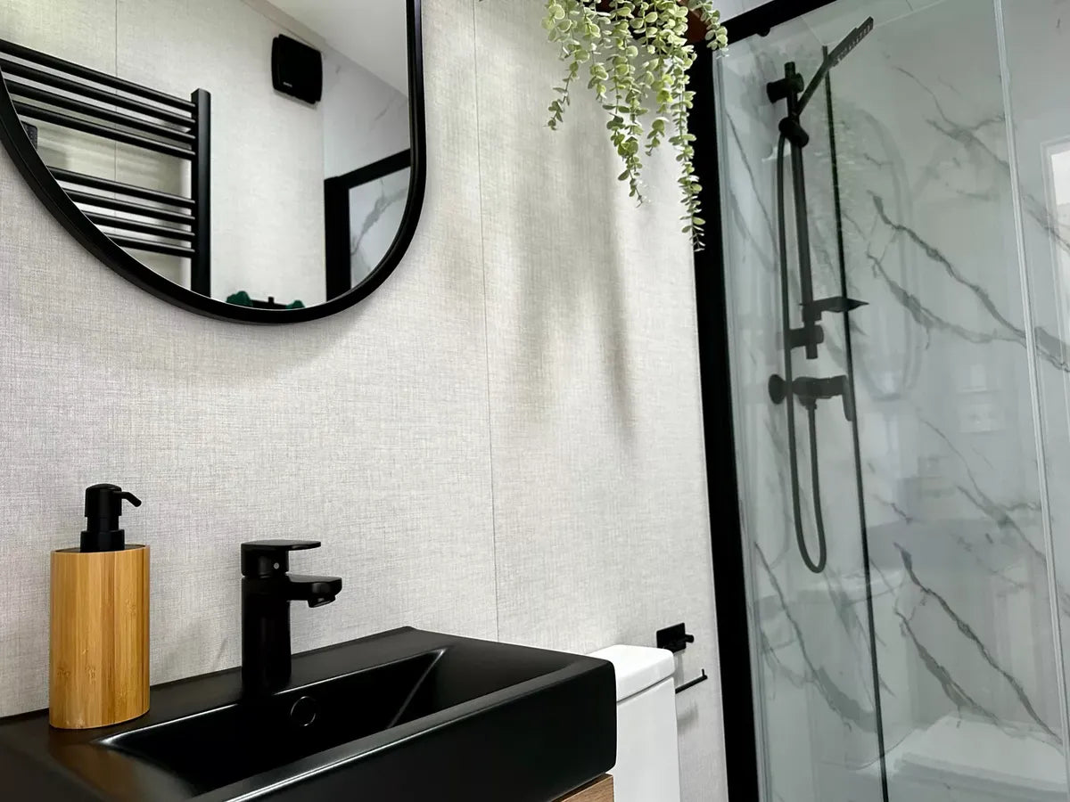 BAÑO acabado con azulejos multiformato en imitación mármol, con amplia cabina de ducha, lavabo con mueble, espejo, toalleros, inodoro.
