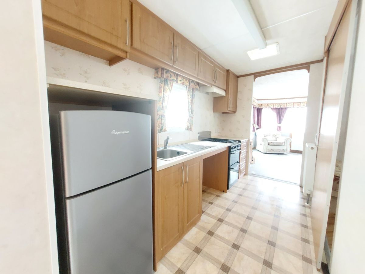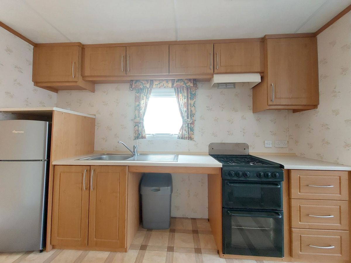 COCINA totalmente equipada con cocina a gas de cuatro quemadores con horno y grill, nevera grande con congelador y fregadero junto a la ventana.